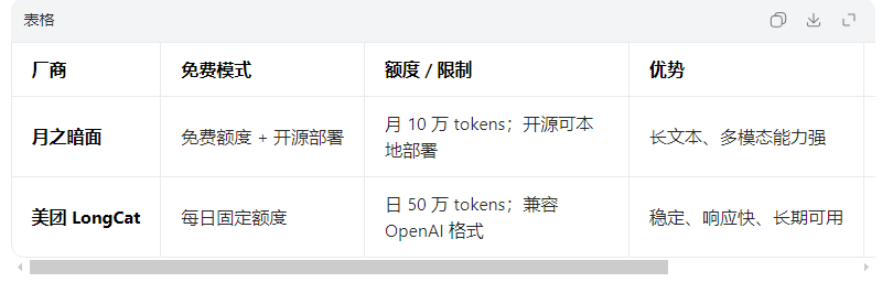 | 美团 LongCat | https://longcat.chat/platform | https://longcat.chat/platform/apikeys |